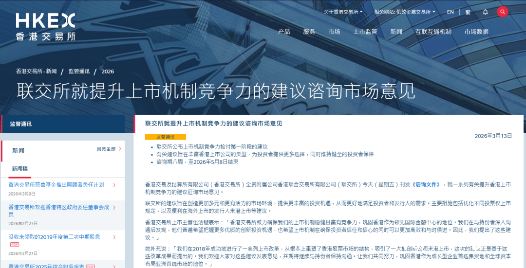 步入2026年,赶赴香港IPO的趋势依旧火热。值此关键时期,香港交易所全资附属公司香港联合交易所有限公司(联交所)于3月13日刊发咨询文件,就一系列有关提升香港上市机制竞争力的建议咨询市场意见。