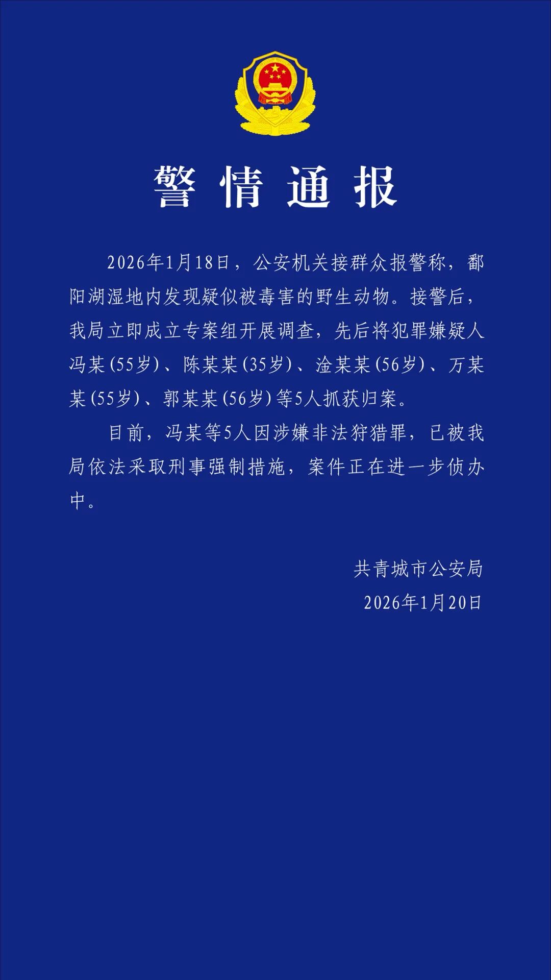 配资交流 江西共青城市警方再通报“鄱阳湖湿地内发现疑似被毒害的野生动物”:5名涉嫌非法狩猎犯罪嫌疑人落网 配资交流 来源:龙信配资 网站:道正网配资 日期:2026-01-21 14:35:21 查看:181